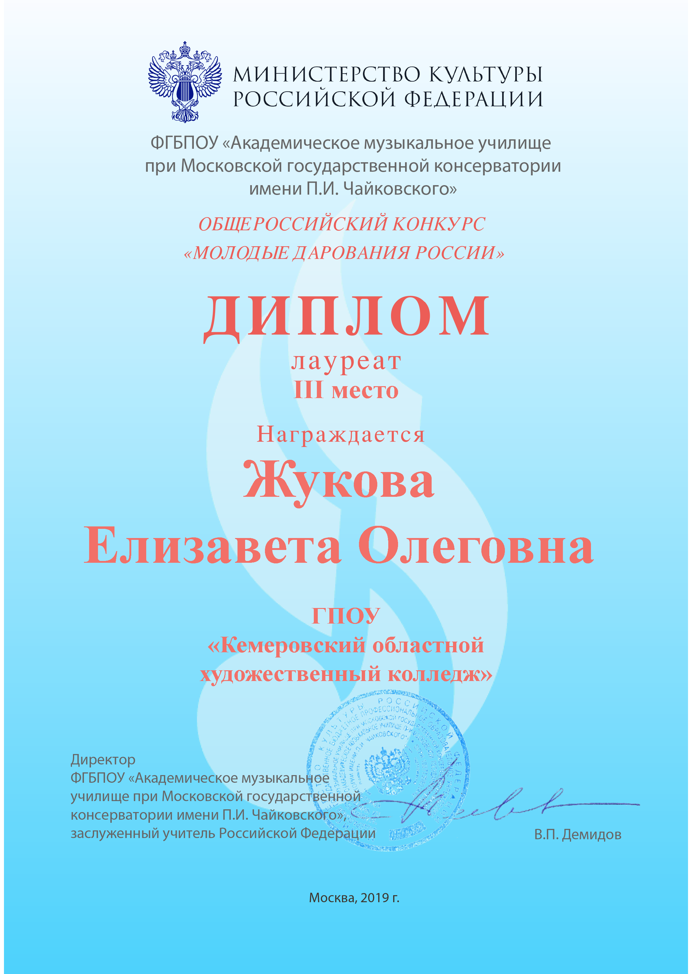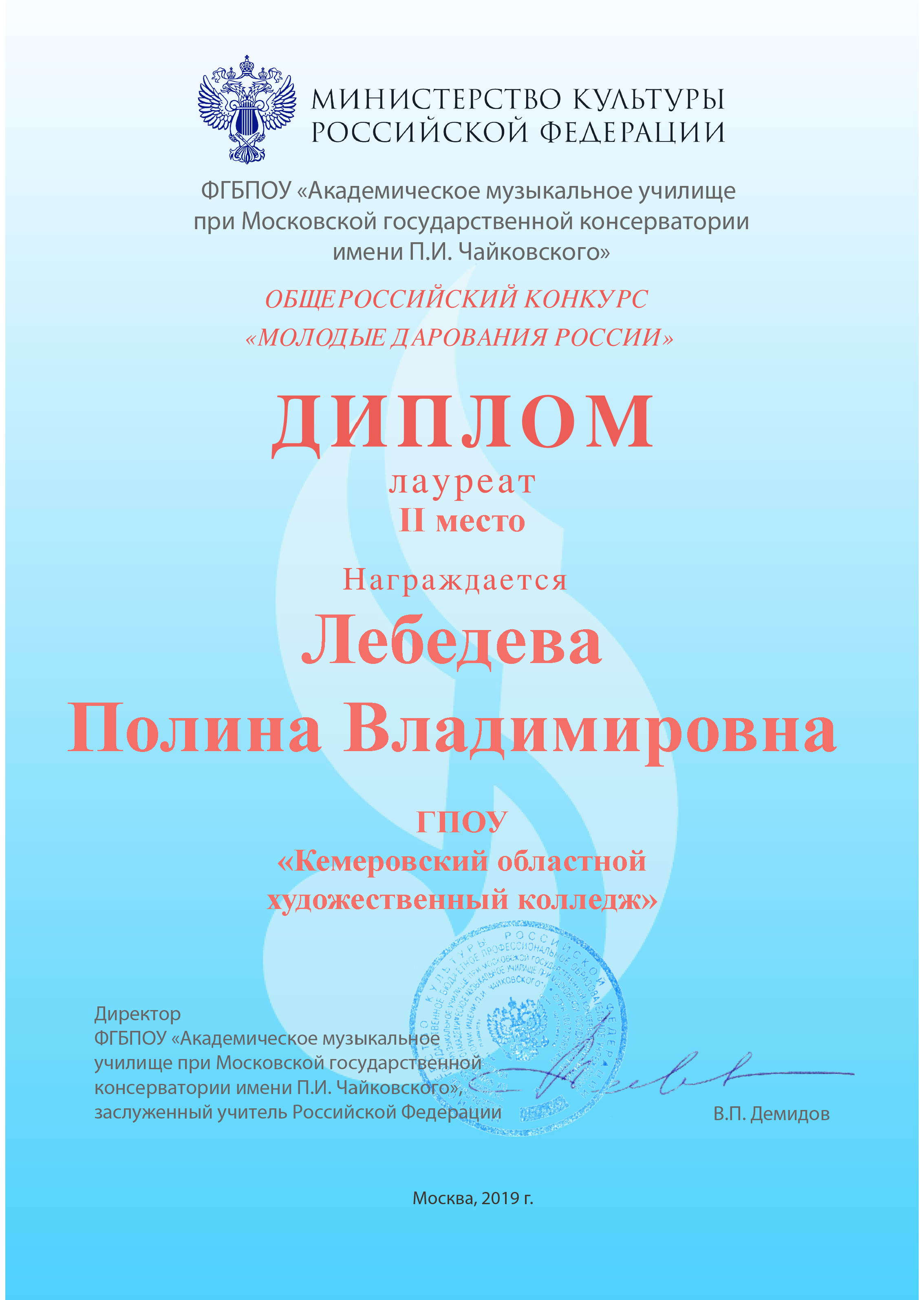 ГПОУ «Кемеровский областной художественный колледж» гордится победой своих студентов: Лебедевой Полиной диплом лауреата за II место (преподаватель Балаганская Е.Н.) и Жуковой Елизаветой диплом лауреата за III место (преподаватель Осипов А.М.) в Общероссийском конкурсе «Молодые дарования России» в номинации «Изобразительное искусство: живопись, акварельная живопись».