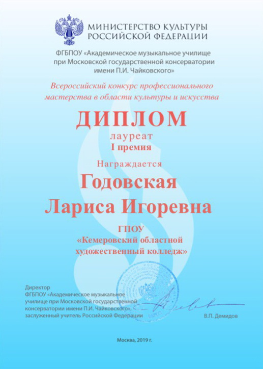 ГПОУ «Кемеровский областной художественный колледж» гордится победой своих студентов: Годовской Ларисой диплом лауреата за I премия (преподаватель Акимова И.П.) в номинации «Дизайн» и Бесковой Анной диплом лауреата за II место (преподаватель Балаганская Е.Н.) «Декоративно-прикладное искусство и народные промыслы» во Всероссийском конкурсе профессионального мастерства в области культуры и искусства.