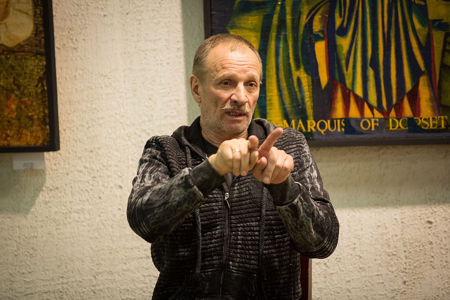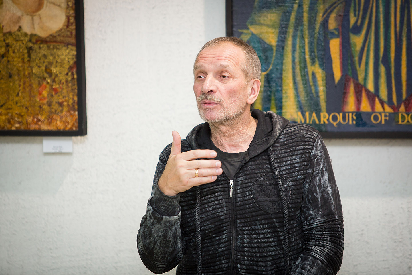 Персональная выставка художника впервые проходит в стенах альма-матер и в нашем городе, и носит название «Посвящение». Это дань памяти педагогу, театральному художнику, главному художнику-постановщику Кемеровского театра драмы Марку Теодоровичу Ривину, создавшему в 1974 г. в Кемеровском художественном училище театрально - декорационную мастерскую.